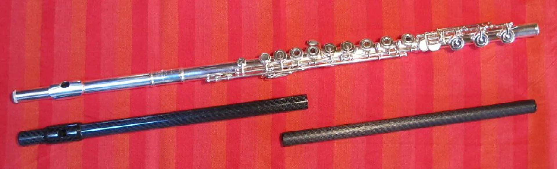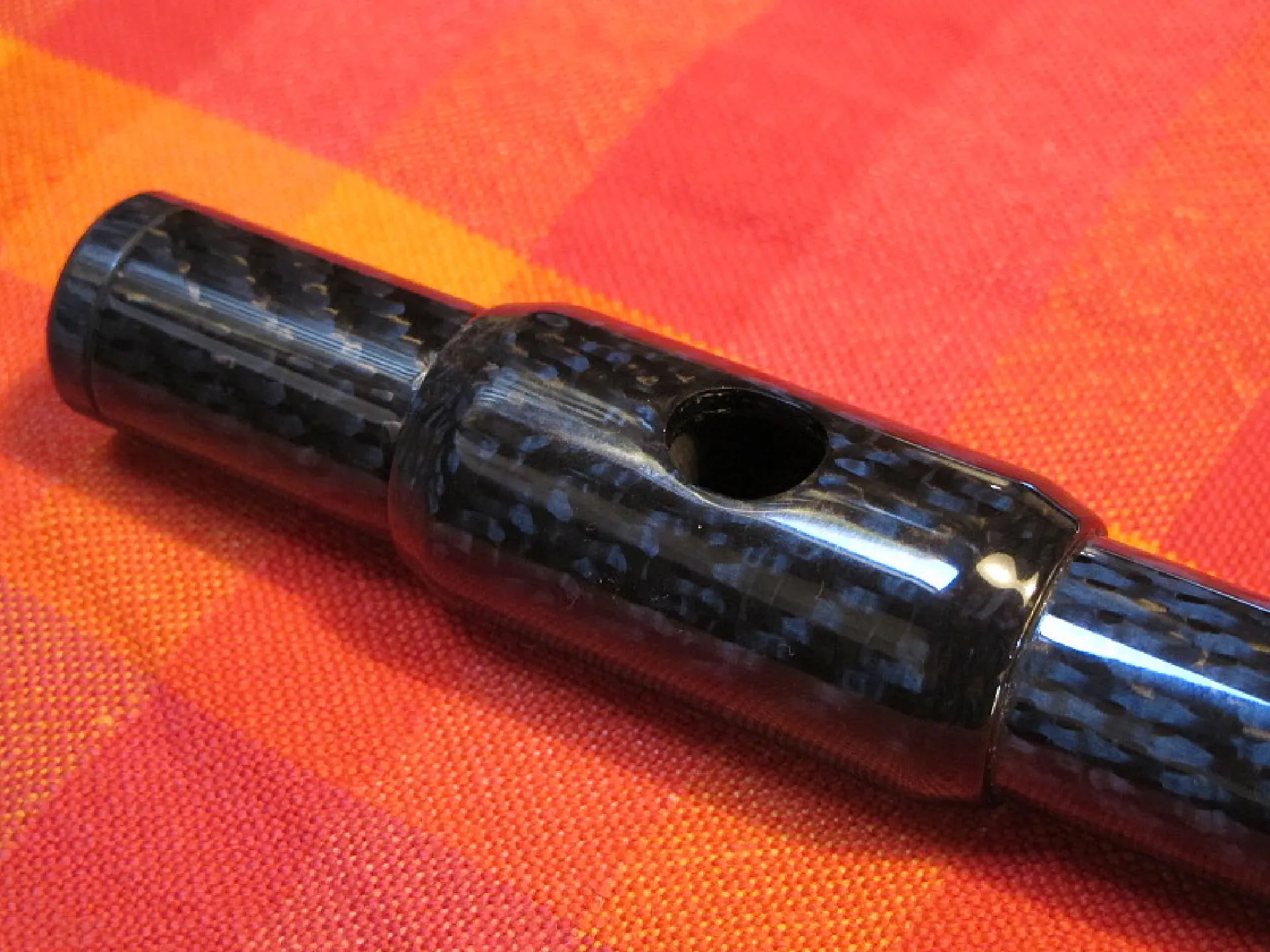 Réalisé en fibres de carbone noires et avec une surface texturée, l’objet lui-même se présente sous un jour assez séduisant. La surface jouant avec la lumière rend cette flûte à la fois jolie et assez difficile à photographier (cliquez sur l’image pour l’agrandir)!