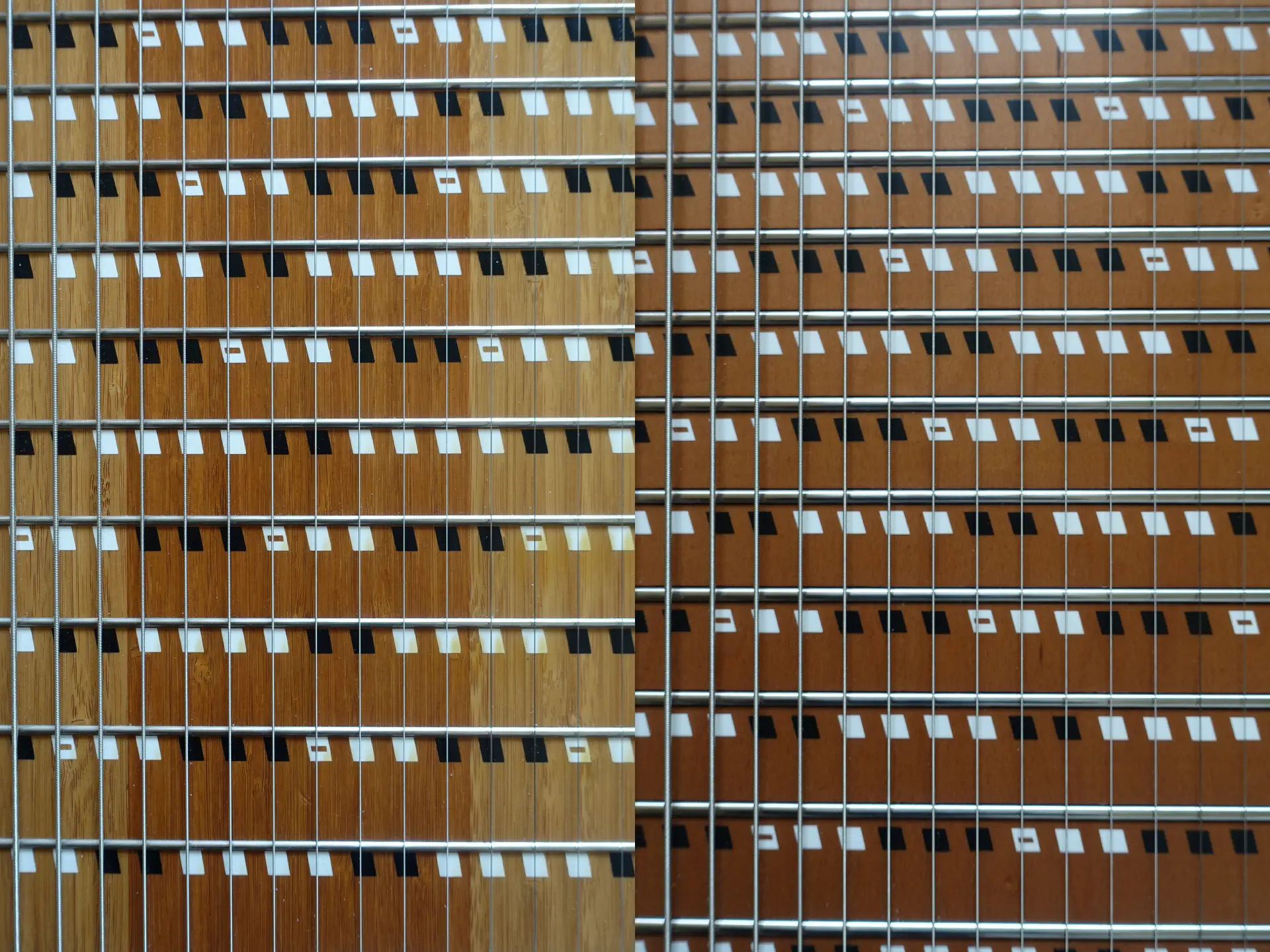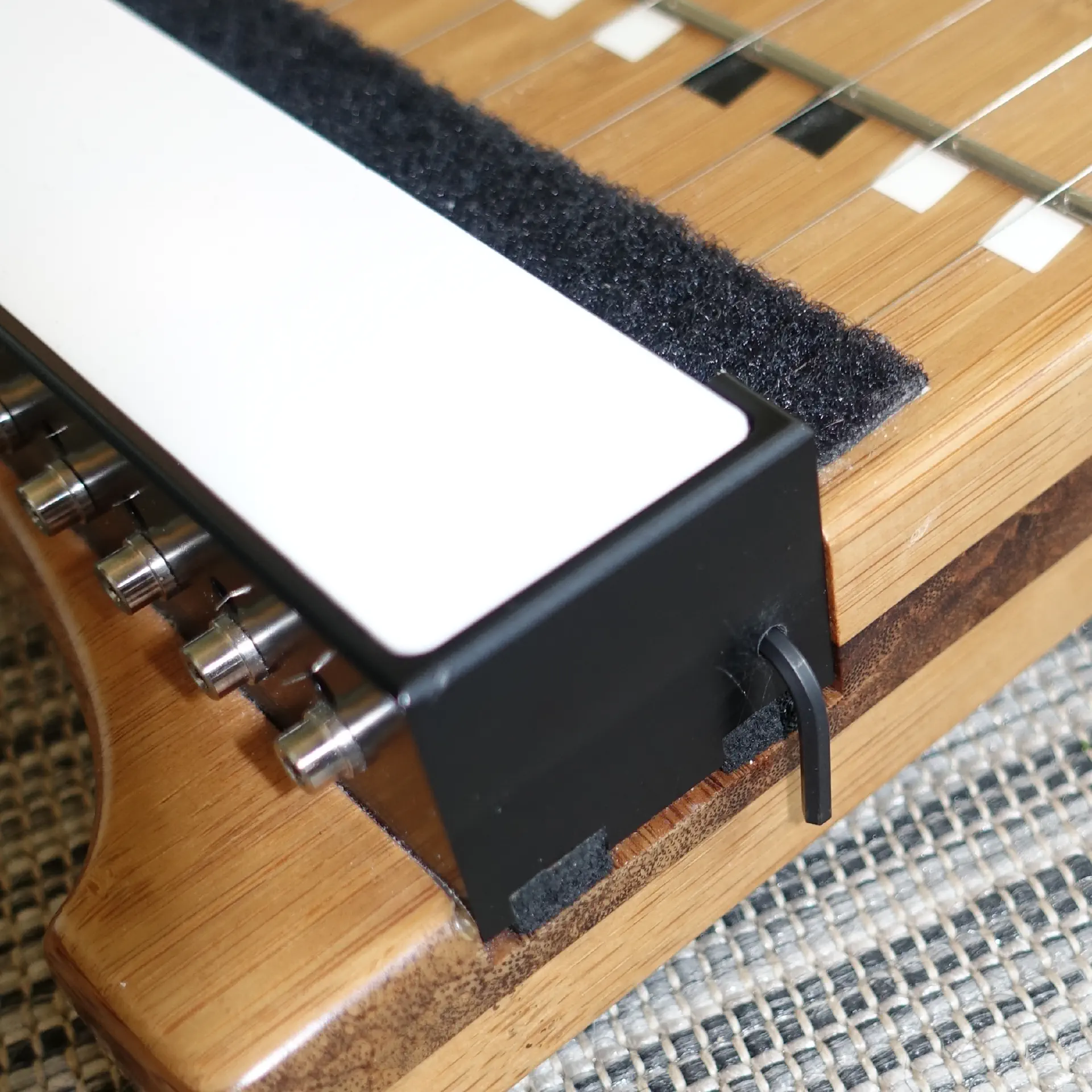 Maybe it’s out of habit, but I prefer the historic “rhombus” note markers rather than the newer “circle” ones (and I truly dislike “ABC” markers, so that was never an option). Hence rhombus is what I chose for my M5. Note that the markers on the new instrument are a few millimeters apart from the frets, unlike the older K24 where the markers were right behind the frets. I think the new design might lure beginners into hitting the strings a little bit too far from the frets, so I’m not sure this was a good design decision. But at least for an experimented player, the difference is very small and quickly gets forgotten.