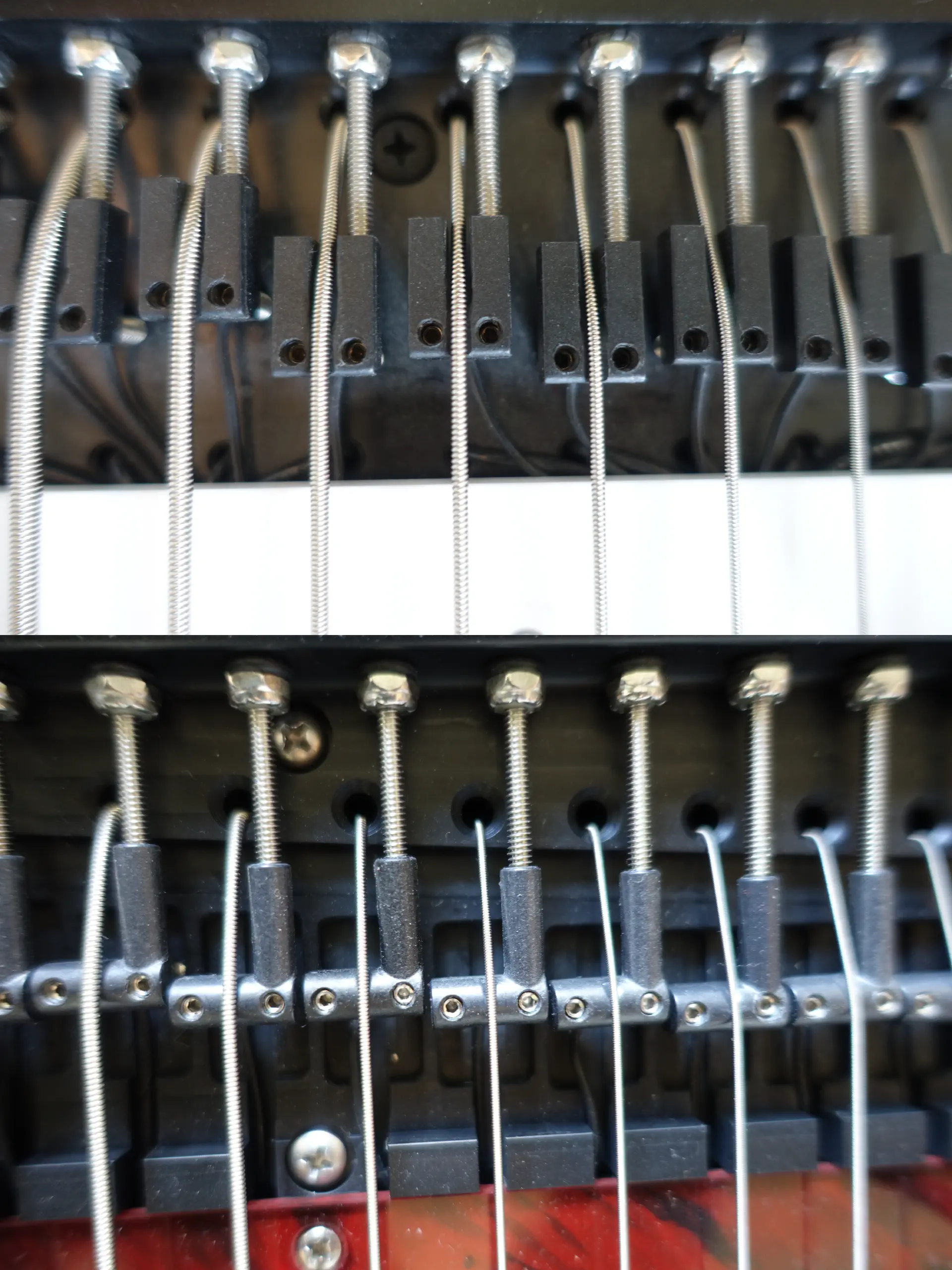 The K24 is using standard guitar saddles that have been filed to accommodate the non-standard gauges. It works, but it means that the lower strings are closer to the pickups than the higher strings, because the saddle has been filed deeper. As the lower strings also naturally have a higher output volume, it necessitates a lot of volume compensation in the electronics to get a balanced volume throughout the instrument.